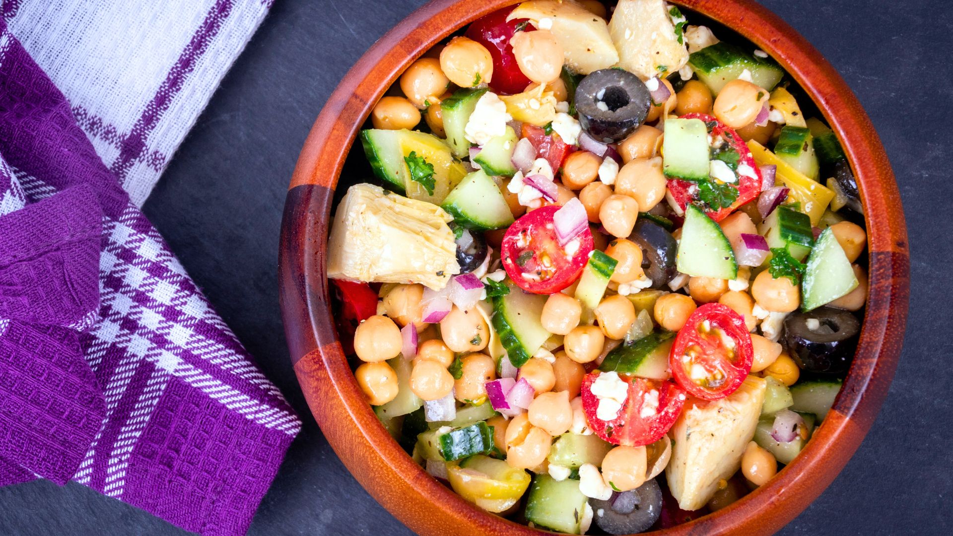 - In a large bowl, combine quinoa, chickpeas, bell pepper, cucumber, and onion.